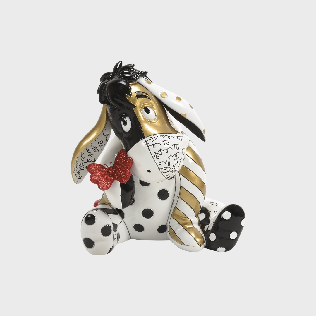 À l’occasion du centenaire légendaire de Winnie l’Ourson, l’univers de la Forêt des Rêves Bleus rencontre l’éclat du Pop Art moderne dans une collaboration historique. La célèbre silhouette de Bourriquet se voit ici métamorphosée par le pinceau magistral de Romero Britto, qui pare l’âne le plus attachant de la littérature d’une robe de lumière baptisée « Midas ». Cette sculpture n’est pas seulement un objet de décoration ; c’est un trait d’union entre la nostalgie de l’enfance et l’audace de l’art contemporain. Dans une pose pensive et attendrissante, Bourriquet s’illumine de motifs dynamiques, transformant sa mélancolie habituelle en une célébration rayonnante de longévité.