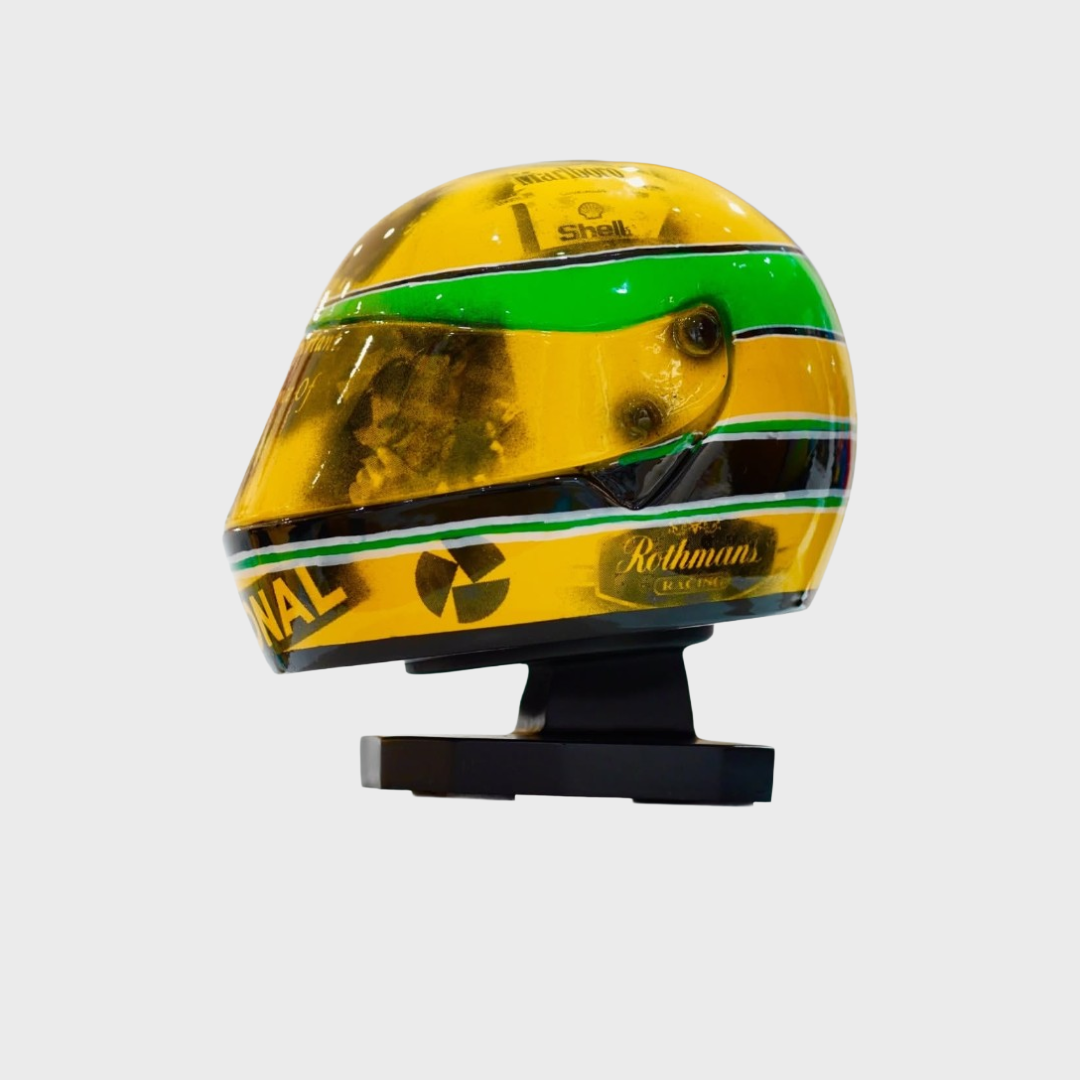 Mini casque de collection Ayrton Senna issu de la Juliani Collection, reproduisant fidèlement le célèbre casque jaune du champion de Formule 1.