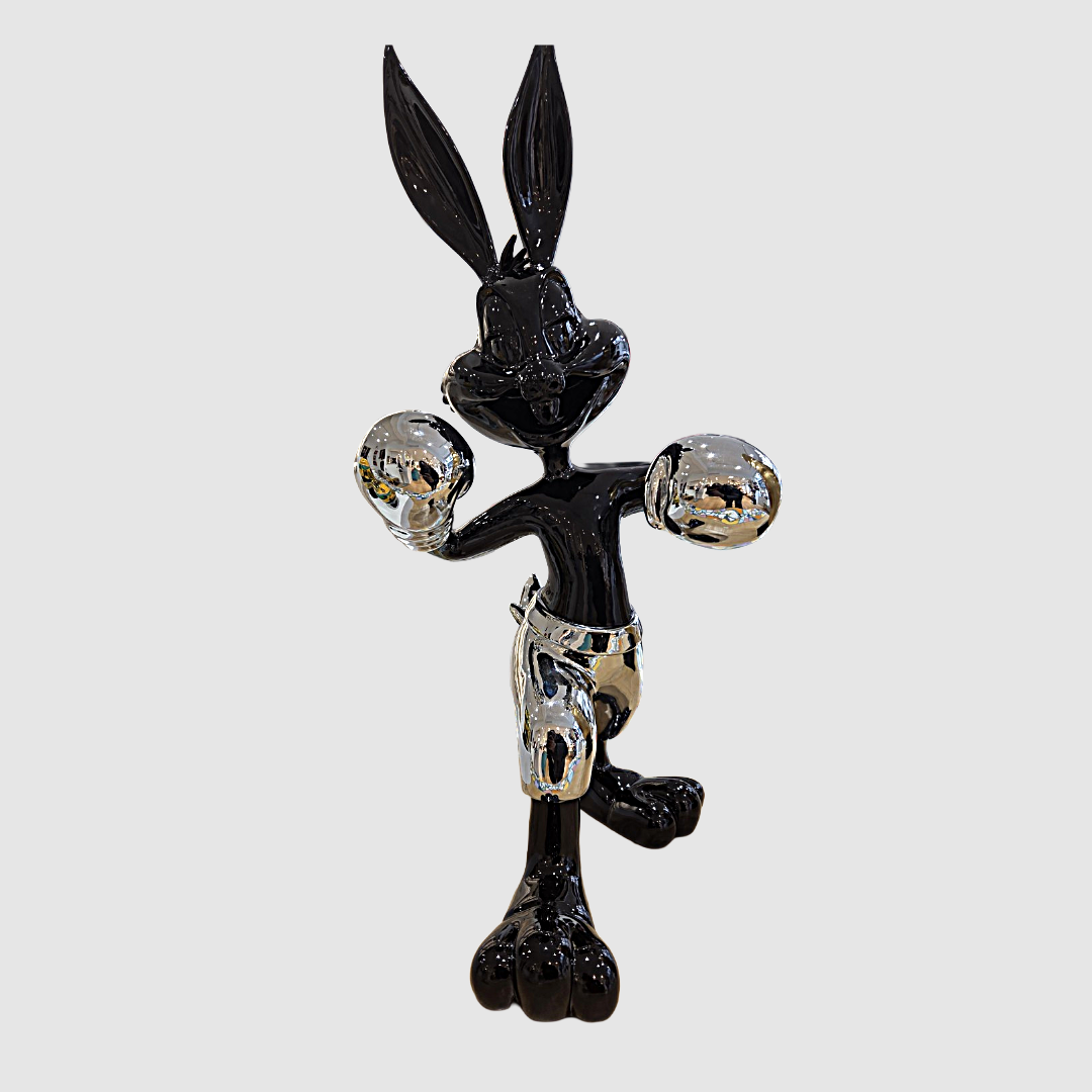 Apportez une signature artistique forte à votre intérieur avec cette sculpture au design audacieux. Inspirée de l’univers pop et street art, cette pièce met en scène un lapin stylisé en posture de boxeur, combinant finitions noir brillant et détails chromés miroir pour un rendu à la fois moderne et premium.