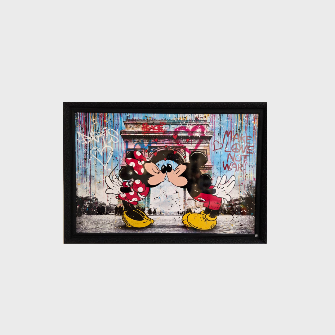 Apportez une touche d’art urbain et de romantisme à votre intérieur avec ce tableau décoratif inspiré du street-art contemporain. Cette œuvre met en scène un couple de personnages cartoon stylisés s’embrassant devant l’iconique Arc de Triomphe, symbole intemporel de Paris. L’ensemble est sublimé par un fond graffiti coloré, des coulures de peinture et des cœurs qui rappellent l’énergie et la spontanéité de l’art urbain.